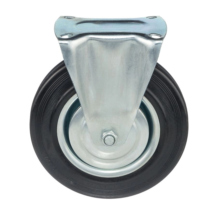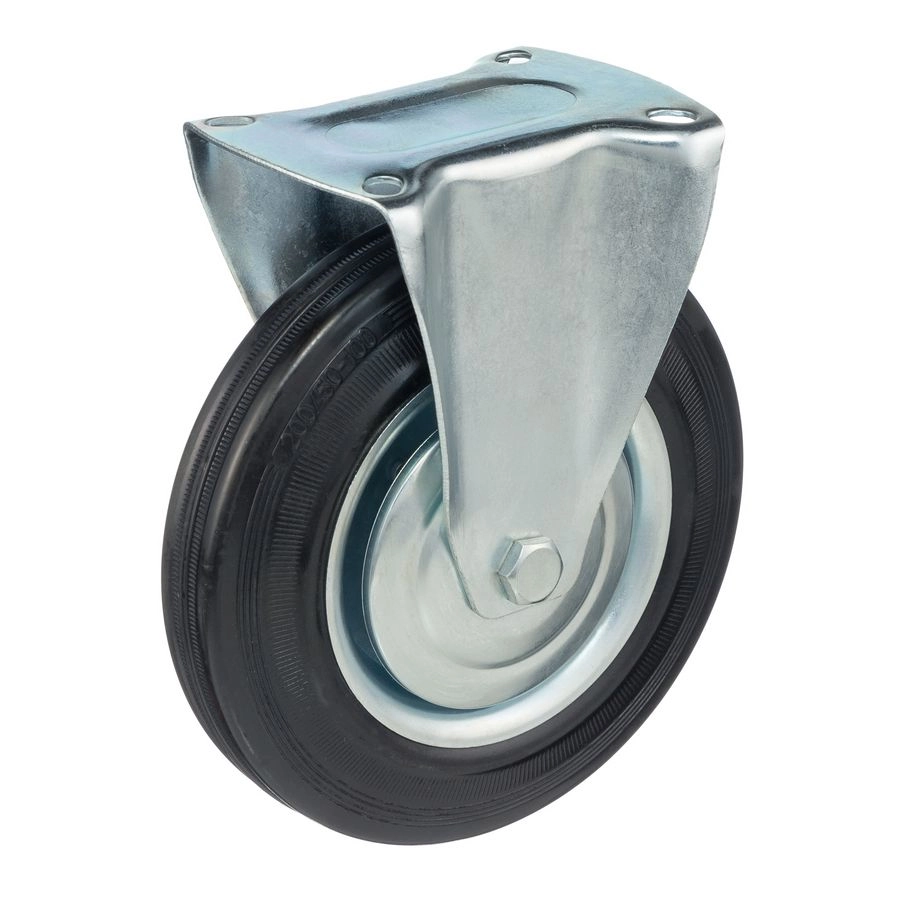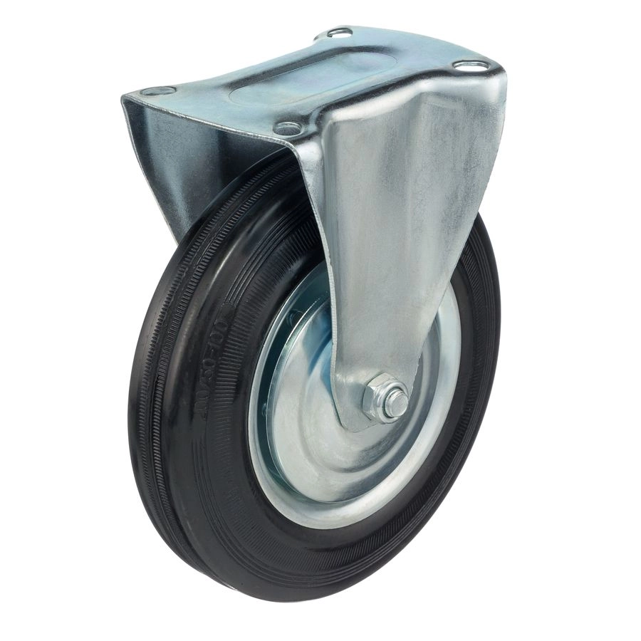 Колесо неповоротное 4002-200, диаметр 200мм., грузоподъемность 185кг. Колеса из черной литой резины, центр из двух гальванизированных дисков из штампованной стали. Роликовый (игольчатый) подшипник расположен в углублении, выдавленном под прессом, и содержит цилиндрические ролики подшипника. Неповоротный кронштейн изготовлен прессованием из листовой стали. Возможно применение на относительно грубых полах складов, заводов, производственных и строительных площадках. Данные колеса можно использовать на неровных поверхностях, во влажной окружающей среде и использовании вне помещения, не рекомендуется применять в среде с органическими растворителями, хлорированными веществами, гидрокарбонатами и минеральными маслами. Температура эксплуатации от -20 до +70С.