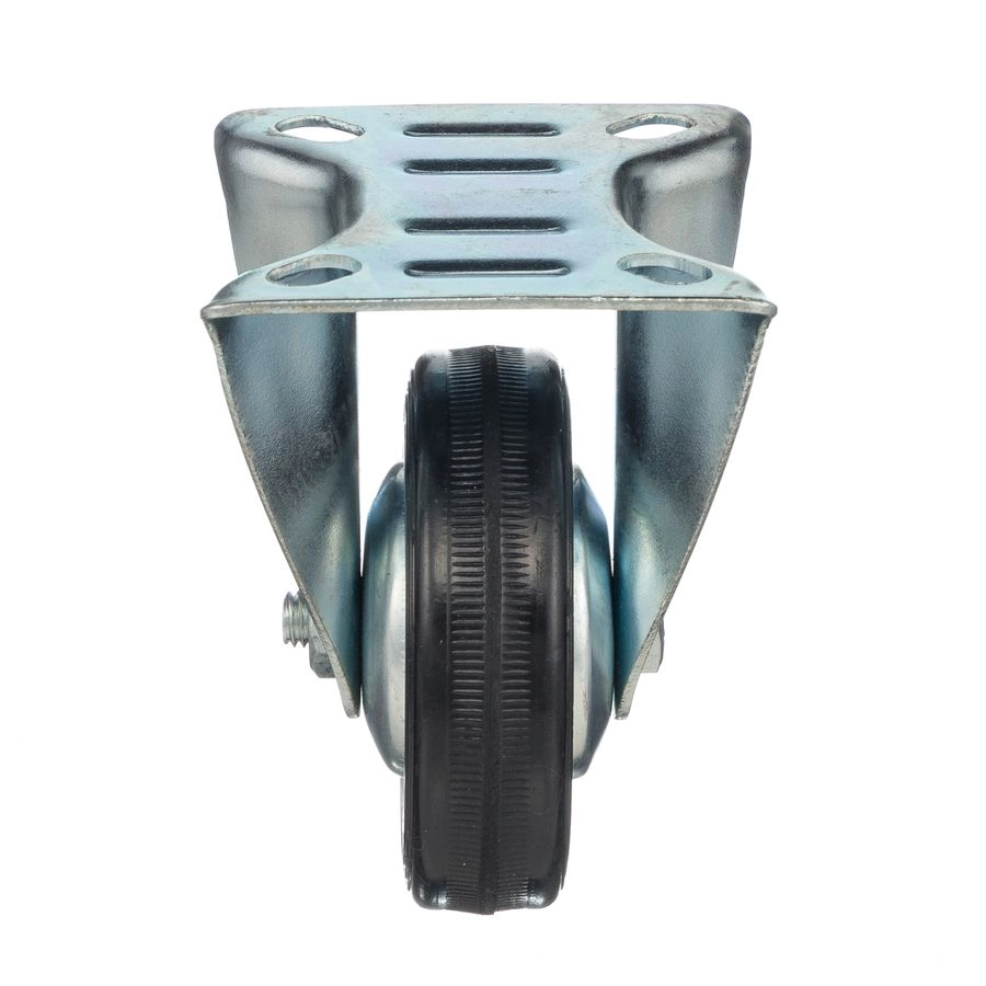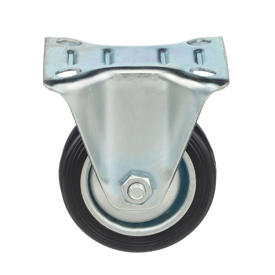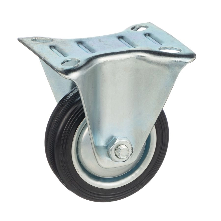 Колесо неповоротное 4002-75, диаметр 75мм., грузоподъемность 50кг. Колеса из черной литой резины, центр из двух гальванизированных дисков из штампованной стали. Роликовый (игольчатый) подшипник расположен в углублении, выдавленном под прессом, и содержит цилиндрические ролики подшипника. Неповоротный кронштейн изготовлен прессованием из листовой стали. Возможно применение на относительно грубых полах складов, заводов, производственных и строительных площадках. Данные колеса можно использовать на неровных поверхностях, во влажной окружающей среде и использовании вне помещения, не рекомендуется применять в среде с органическими растворителями, хлорированными веществами, гидрокарбонатами и минеральными маслами. Температура эксплуатации от -20 до +70С.