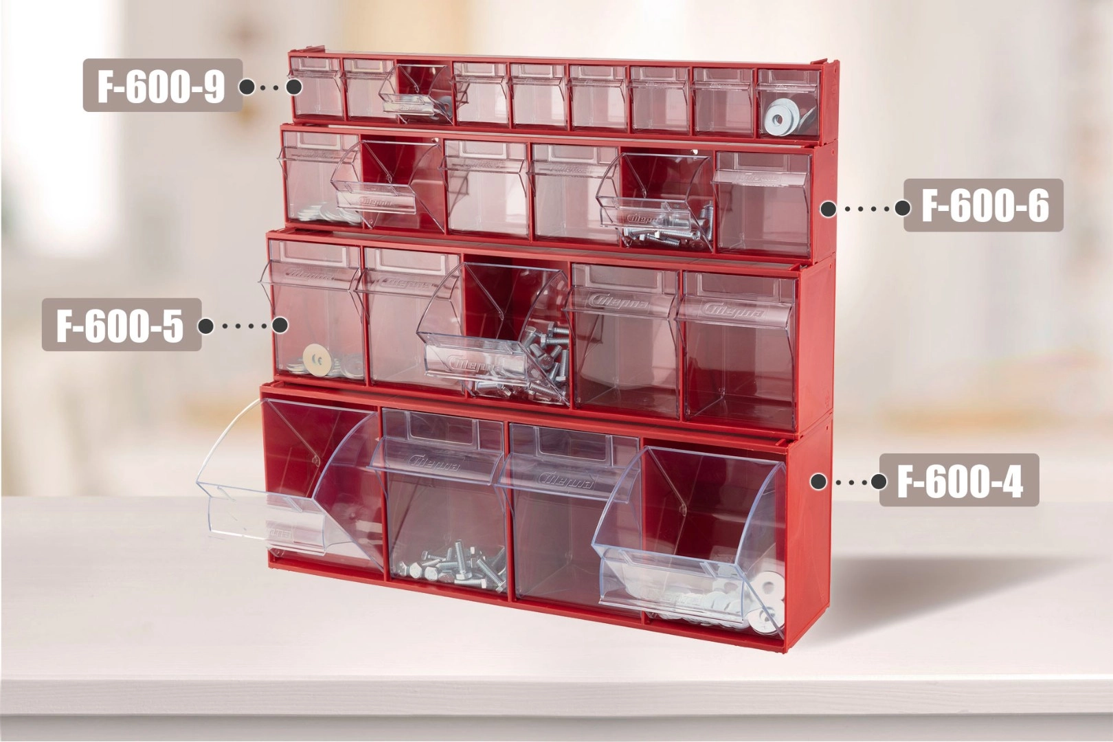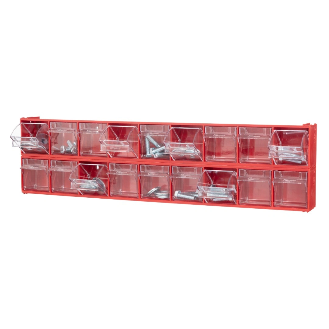 Короб откидной Стелла-техник F-600-9 (600х68х78мм.) 9 ячеек, красный, прозрачный служит для хранения мелкоштучных предметов. Данная система хранения не подвержена случайному опрокидыванию. Откидные стандартные ячейки обеспечивают быстрый доступ к необходимым предметам. В случае необходимости полного высыпания или наполнения внутренние ячейки легко извлекаются. Полезный внутренний размер каждой ячейки 56х43х64мм. Специальный пластик, из которого выполнен короб, выдерживает значительные нагрузки и обладает оптимальной эластичностью. На основе данных коробов можно сформировать многоярусную систему хранения вертикально, в том числе и с коробами большего размера, таких как F-600-6, F-600-5 и F-600-4 по принципу пирамиды. Использование в качестве дополнительного элемента специальных металлических рам, позволяет комплекту коробов нести большие нагрузки в напольном, настольном и настенном варианте. Короб данной модели легко можно прикрепить к стене или установить на специальные кронштейны (Артикул: Кронштейны-FOX-750). Обзорность содержимого сквозь прозрачные внутренние ячейки, наличие отсека для информационных бирок, легкое извлечение внутреннего короба для опустошения и наполнения, все это является неоспоримым преимуществом откидных коробов серии F. Температура эксплуатации от -10 до +70С.