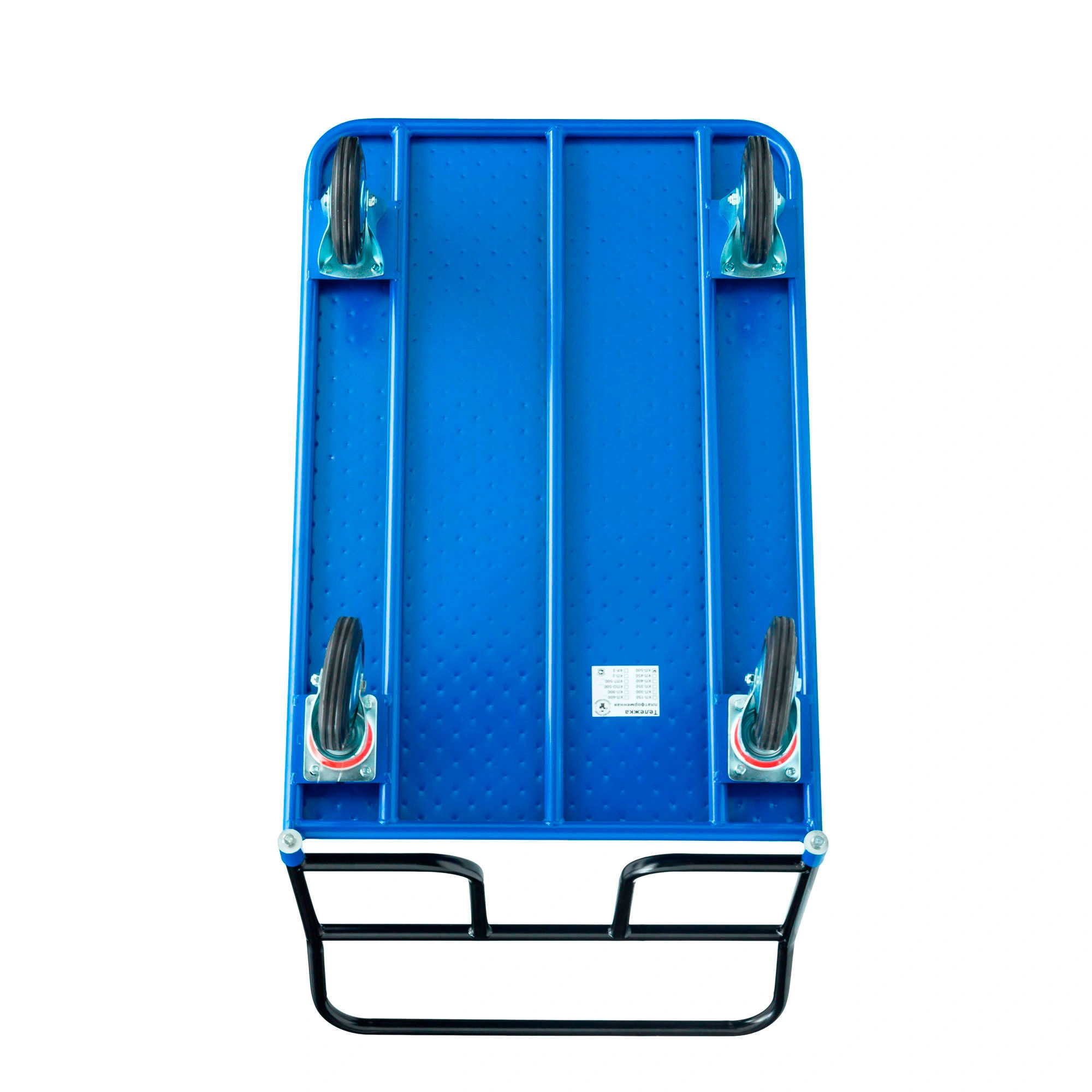 На платформе синего цвета допускается размещать до 300 кг грузов. Тележка приводится в движение за счет толкания прочной и удобной ручки черного цвета с болтовым креплением. Металлические части устройства подвергаются полимерной порошковой обработке, что защищает конструкцию от влаги, пыли, ветра, солнечных лучей и пр.