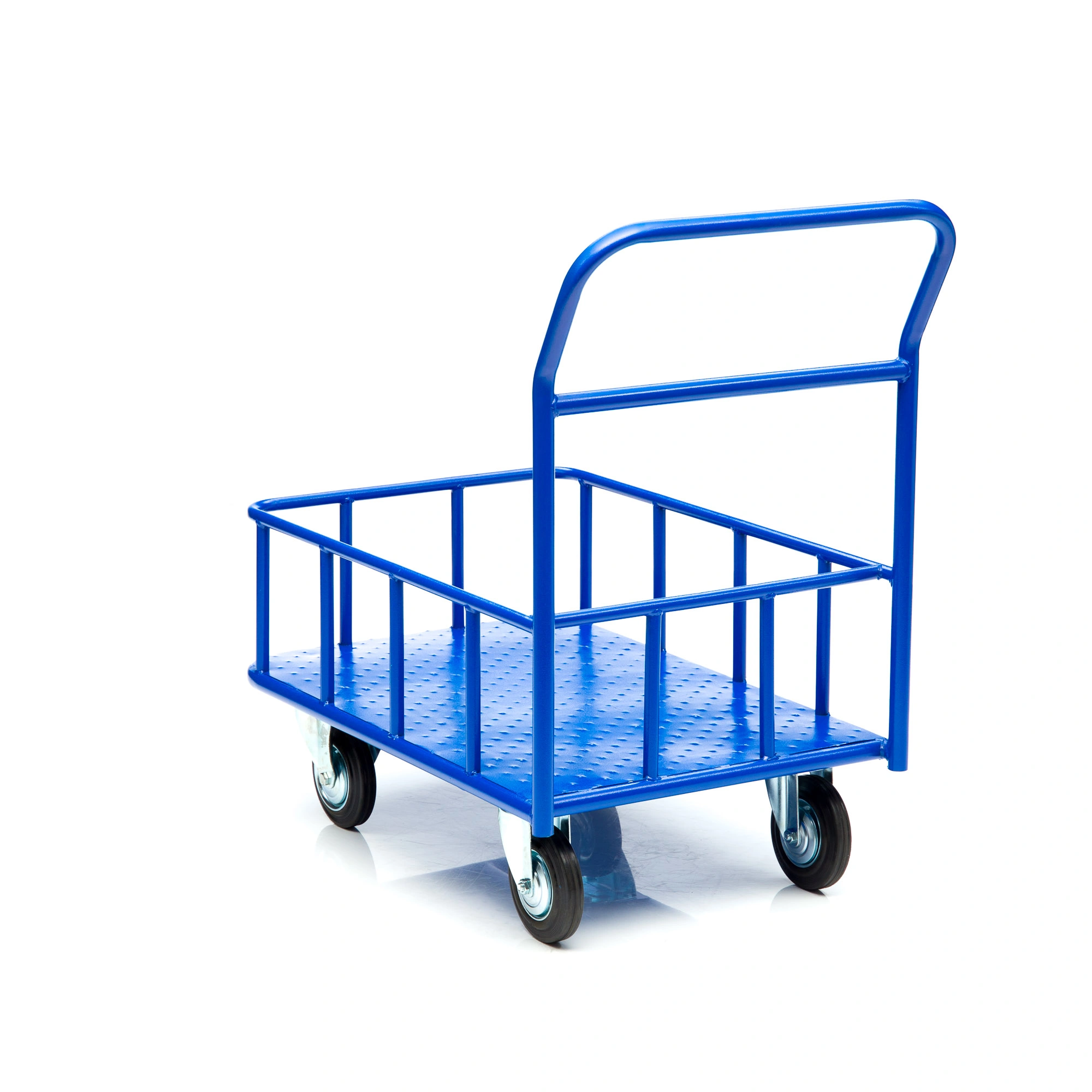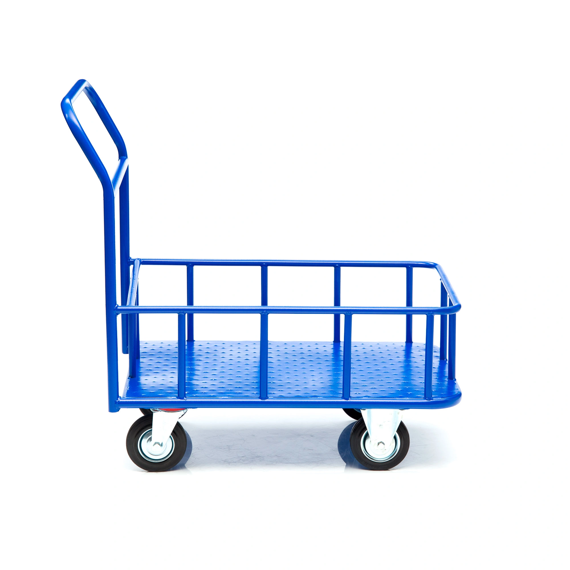 Платформенная 4-х колесная тележка КПБ-300-125-И (с бортом) используется для перемещения различных грузов, как в промышленности, так и в условиях склада или вокзала. Конструкция тележки цельносварная. Размер платформы 600х900мм., высота борта 150мм., высота ручки 750мм., Платформа имеет уникальную рельефную полимерную противоскользящую поверхность. Цвет - синий, шагрень. Малые габариты, удобная ручка и поворотные колеса обеспечивают высокую мобильность средства, 4 точки опоры гарантируют устойчивость тележки, а наличие невысоких бортов гарантирует безопасность перевозимого хрупкого и мелкоштучного груза. Тележка комплектуется: метизами для крепления, двумя поворотными и двумя неповоротными промышленными колесами, диаметром 150мм., из черной стандартной резины, от всемирно известного, ведущего итальянского производителя Tellure Rota. Грузоподъемность до 450кг.