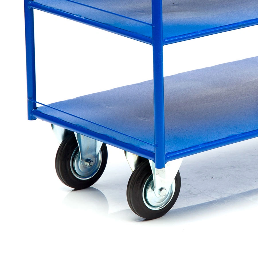 Платформенная трехъярусная 4-х колесная тележка КР-3-150-И предназначена для перевозки малогабаритных грузов. Платформа металлическая толщина листа 1,2мм. Размер платформы 600х900мм. Расстояние между ярусами 300мм. Количество ярусов 3 шт. Габаритная высота 1000мм. Покрытие полимерное. Цвет - синий, шагрень. Тележка КР-3-150-И комплектуется: двумя поворотными и двумя неповоротными промышленными колесами, диаметром 150мм., из черной стандартной резины, от всемирно известного, ведущего итальянского производителя Tellure Rota, метизами для крепления. Благодаря наличию трех ярусов, тележка широко используется на складах, в торговых павильонах, а также в гостиничном и ресторанном бизнесе. Грузоподъемность до 450кг.